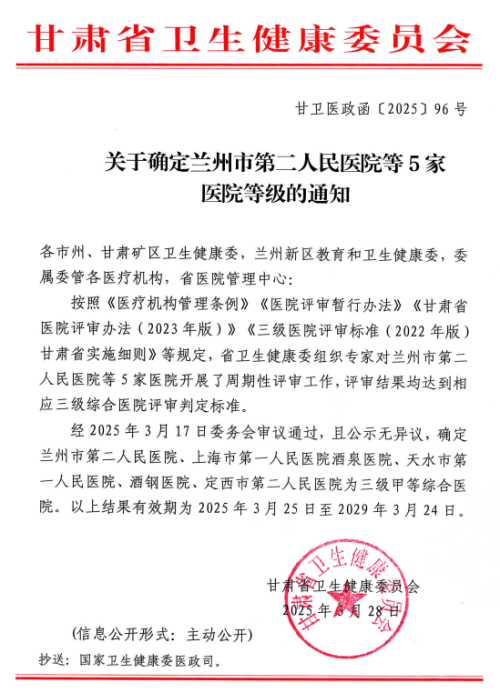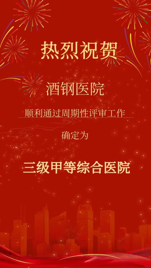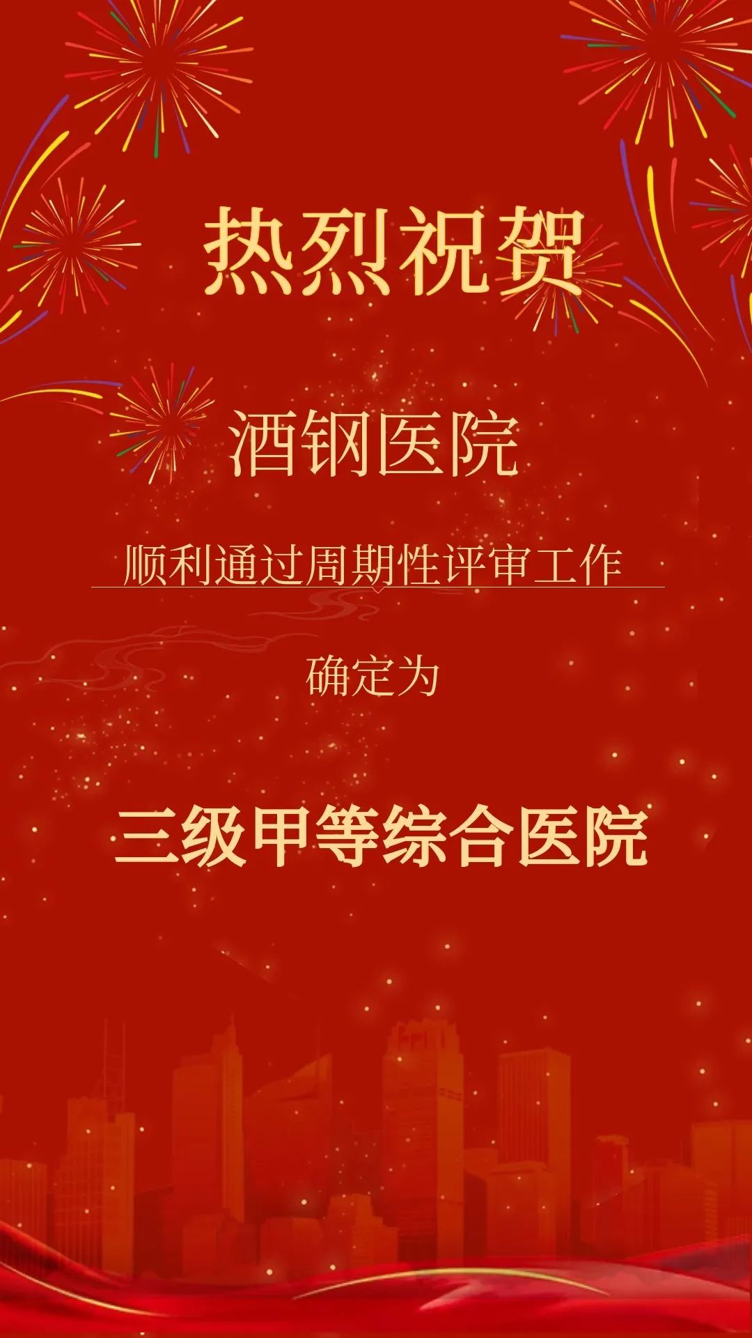 2025年3月28日,甘肃省卫生健康委正式发文,经过资格审查、现场评审、综合评分、结果公示,确定酒钢医院为三级甲等综合医院。这是酒钢医院继2020年成功获评三级甲等综合医院后,顺利通过“三甲”复审。