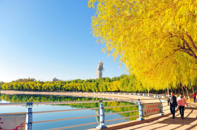 10月20日,东湖生态旅游景区在蓝天白云的掩映下,宛如一幅五彩缤纷的美丽画卷,吸引市民前来休闲锻炼。 融媒体中心记者 高深 摄
