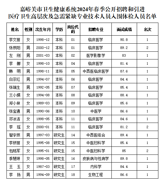 嘉峪关市卫生健康系统2024年春季公开招聘和引进医疗卫生高层次及急需紧缺专业技术人员体检、考察和资格复审有关事项的通知