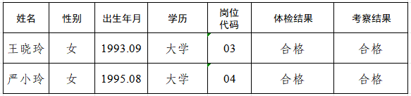嘉峪关市2025年卫生健康系统基层医疗机构聘用制执业医师面试、体检及考察工作已全部结束。此前,王晓玲因怀孕、严小玲因哺乳未能完成体检,现两人已全部完成体检。现公布体检、考察结果,并将拟聘用人员名单公示如下,请社会各界监督。