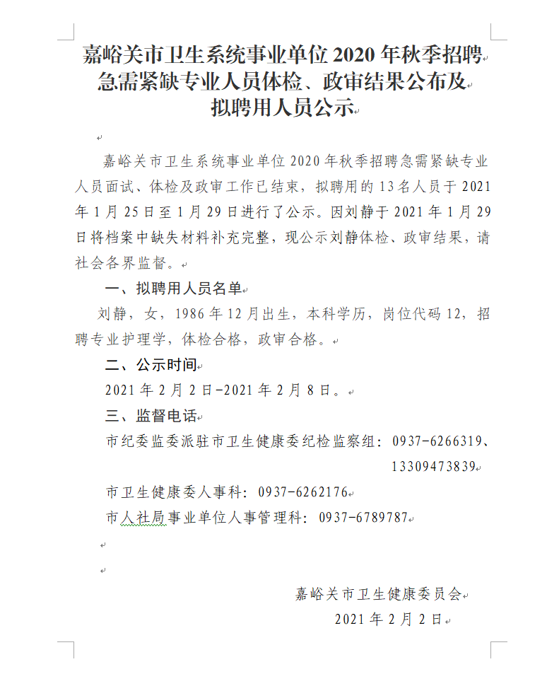 嘉峪关市卫生系统事业单位2020年秋季招聘急需紧缺专业人员体检、政审结果公布及拟聘用人员公示