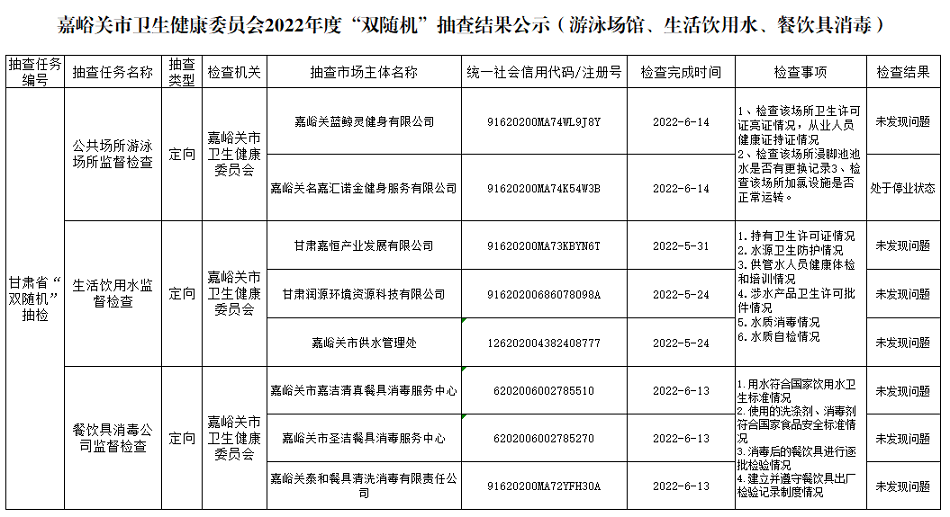 嘉峪关市卫生健康委员会2022年度“双随机”抽查结果公示(游泳场馆、生活饮用水、餐饮具消毒)
