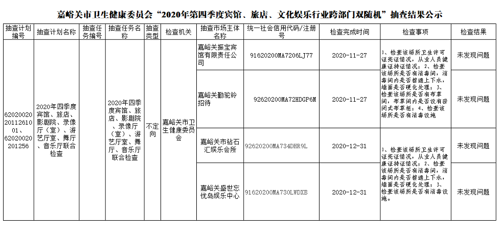 嘉峪关市卫生健康委员会“2020年第四季度宾馆、旅店、文化娱乐行业跨部门双随机”抽查结果公示