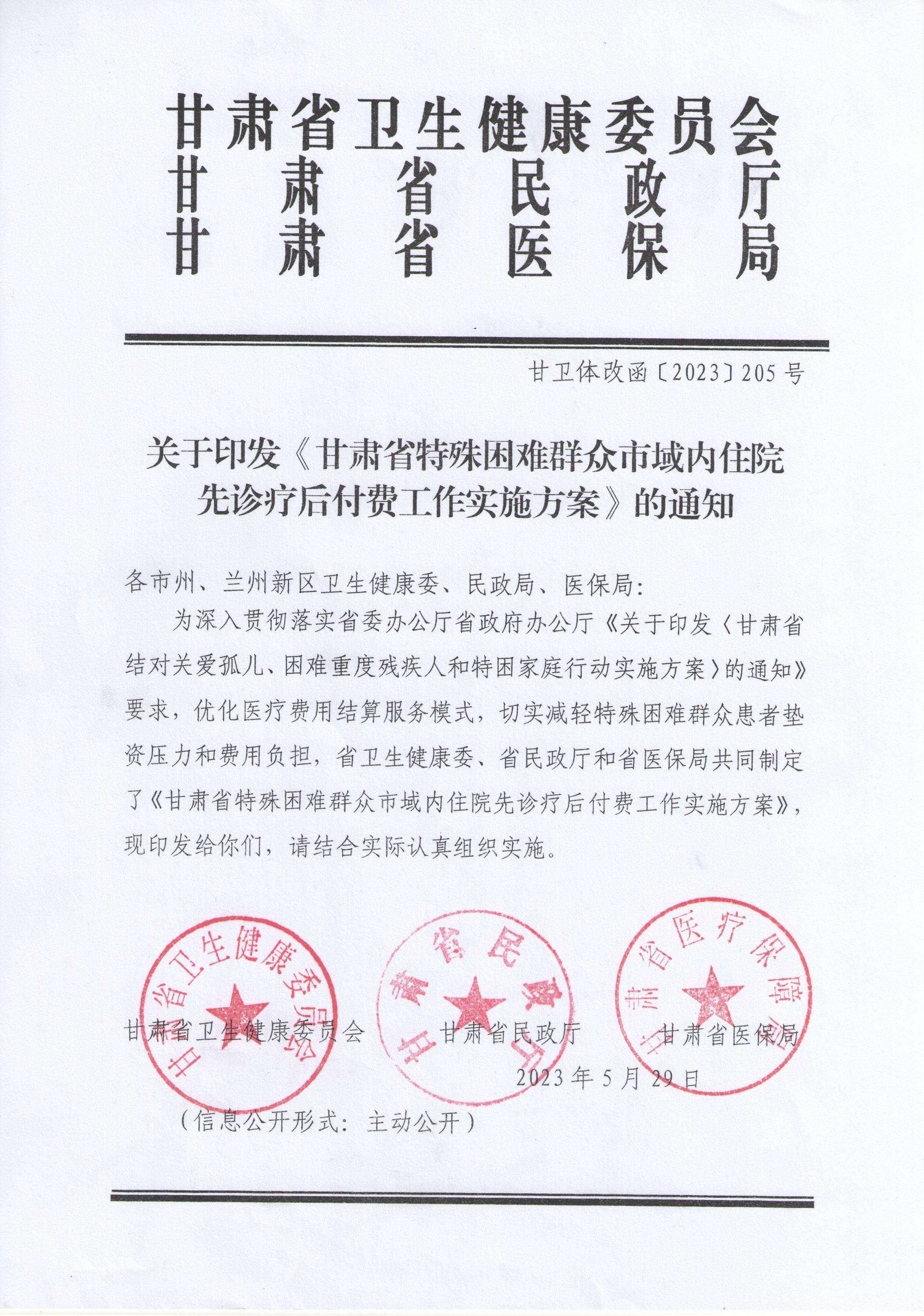 关于印发《甘肃省特殊困难群众市域内住院先诊疗后付费工作实施方案》的通知