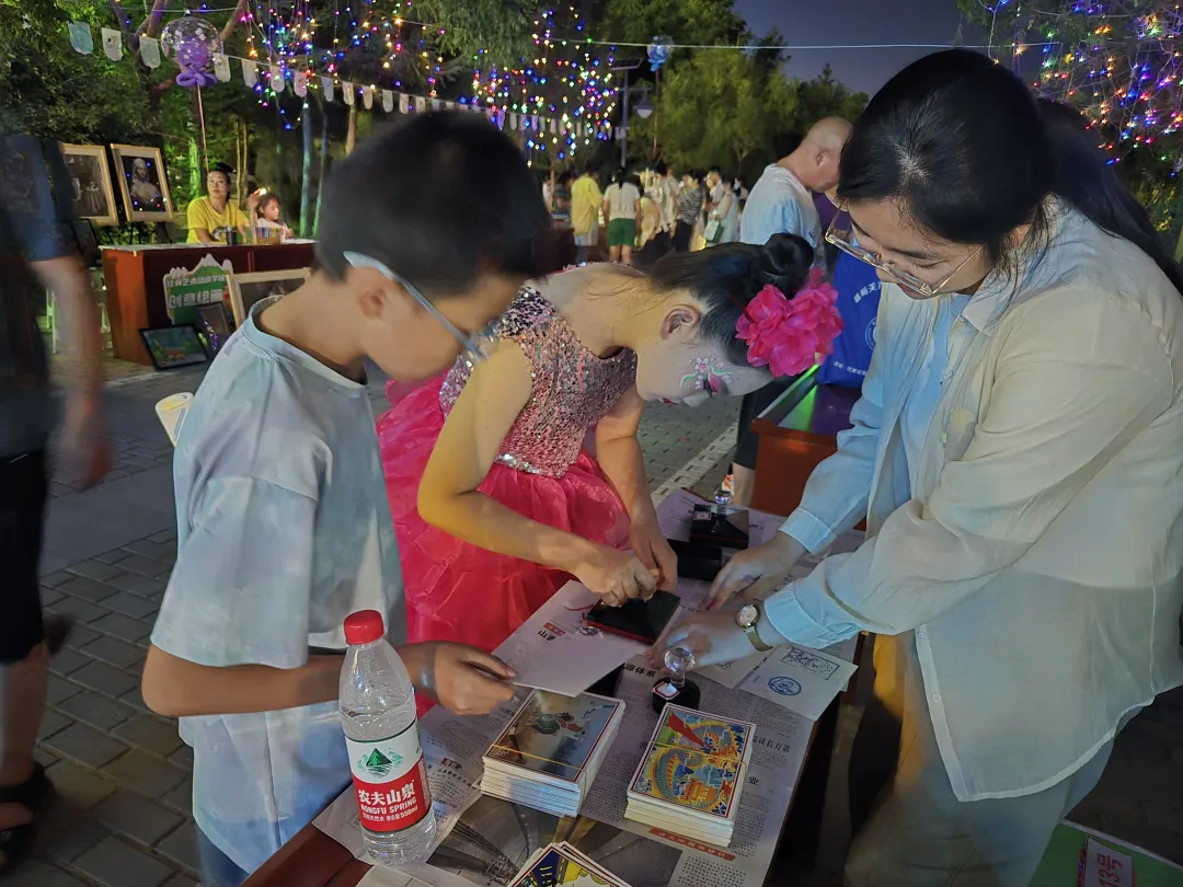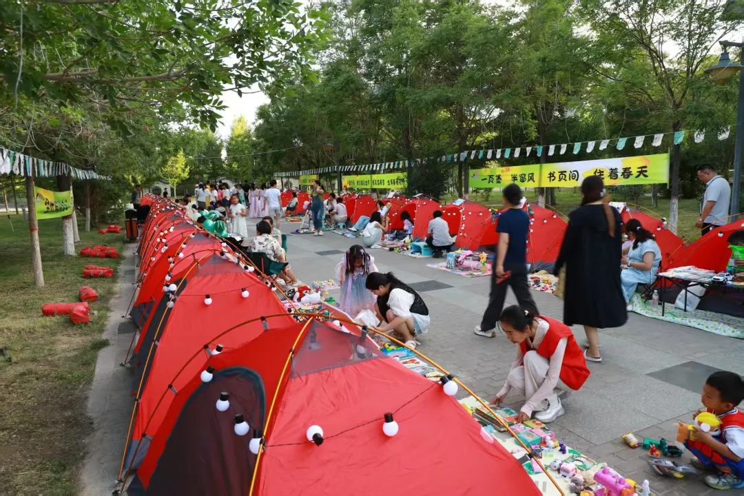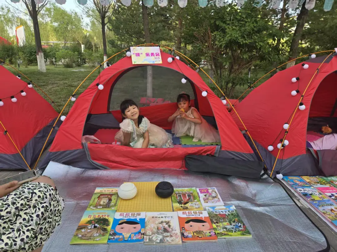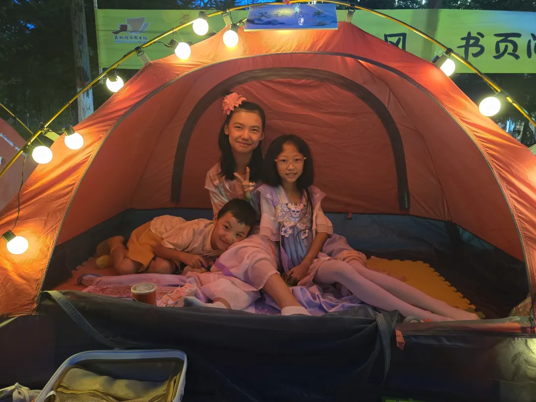 三十组家庭精心构思,将“不期而遇的夏天”“选择玩具诊所”“夏日趣多多”“玩具过家家”等独特主题搬进帐篷——自主装饰的帐篷与周边环境相映成趣,晕染出个性满满的阅读氛围。夜幕下,大家围坐共读,书页间的精彩在灯光下流转;交换书籍与玩具的欢笑声此起彼伏。梦幻灯火漫过每一张笑脸,让这方天地化作满溢暖意的书香海洋。