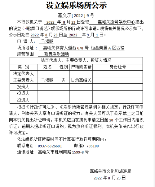 设立娱乐场所公示(嘉峪关捌号娱乐中心)