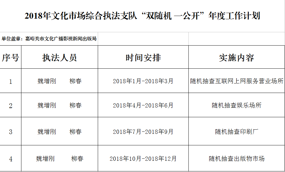 2018年文化市场综合执法支队“双随机 一公开”年度工作计划