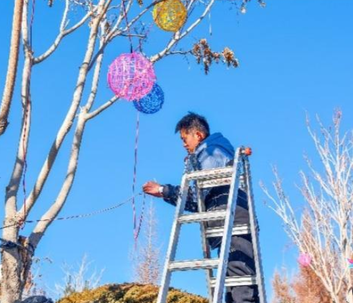 12月23日、24日,记者在雄关广场、新华路部分路段看到,一盏盏柿子、南瓜、福袋、藤球灯和风车、卡通灯,以及彩色灯带等错落有致地挂在树梢,各种造型灯饰让人眼前一亮,部分已安装并点亮的灯饰在夜幕下霓虹闪烁、流光溢彩,为冬日的嘉峪关增添了热情与活力。在雄关广场上,工作人员正在加紧实施各类灯组安装,施工点繁忙而有序,喜庆氛围越来越浓。