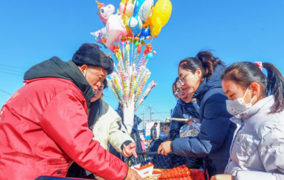 再往里走,诱人的香气扑面而来,麻辣烫摊位上人头攒动,尤其是网红麻辣烫摊前,排队的食客络绎不绝,大家纷纷等待着吃一碗热乎乎的特色麻辣烫,餐桌上食客们细品着蘸满了油辣椒香气四溢的麻辣粉,驱散寒意的同时脸上洋溢着满足的笑容,摊主更是忙得不亦乐乎。金黄并泛着油光的烤红薯、晶莹剔透的糖葫芦、种类繁多的各色糖果、琳琅满目的蔬菜水果,构成了一幅热闹的市井画卷。摊主李师傅手忙脚乱地一边称重一边告诉顾客:“我这小油菜是早上刚从大棚里摘的,嫩得很!”正在选购的李阿姨笑着说:“就喜欢大集上的这股子热闹劲儿,还能买到特色农产品,可选商品多,价格也实惠!”在叫卖声和欢笑声中,集市上呈现出一派购销两旺、喜气洋洋的红火景象,年的味道愈发浓厚。