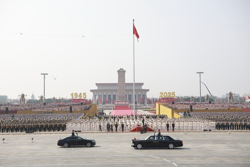 9月3日,纪念中国人民抗日战争暨世界反法西斯战争胜利80周年大会在北京天安门广场隆重举行。中共中央总书记、国家主席、中央军委主席习近平发表重要讲话并检阅受阅部队。这是习近平乘检阅车,经过金水桥,驶上长安街。