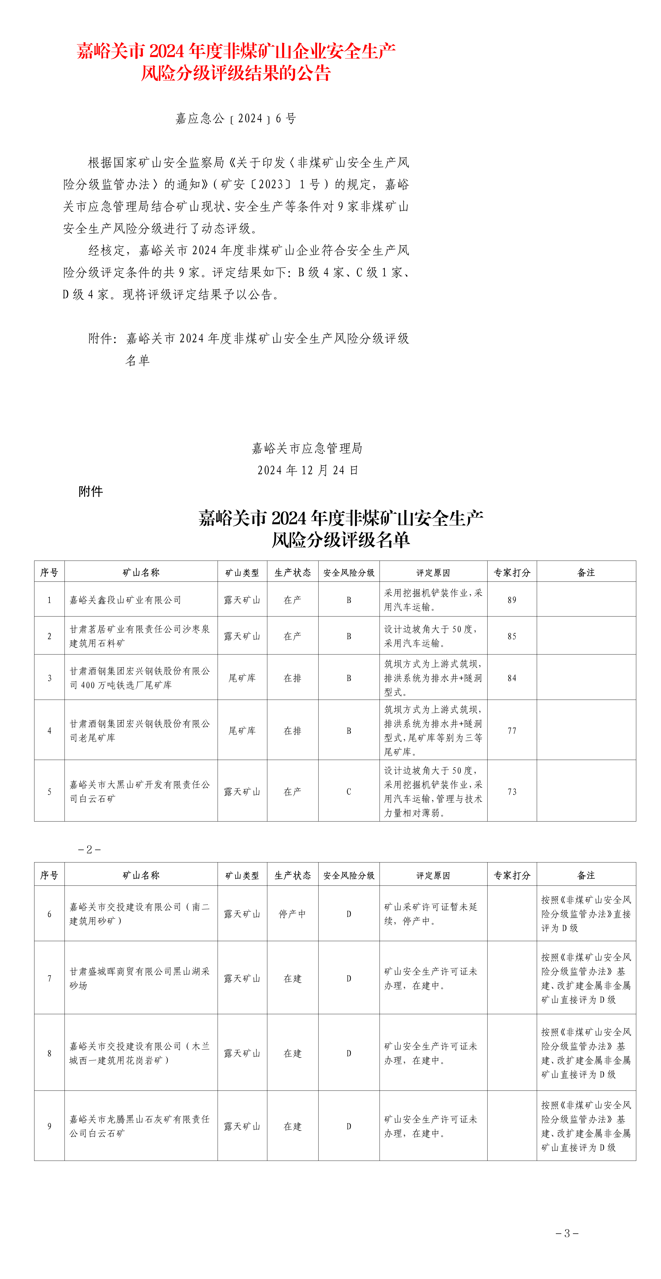 嘉峪关市2024年度非煤矿山企业安全生产风险分级评级结果的公告