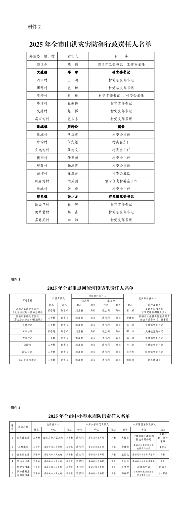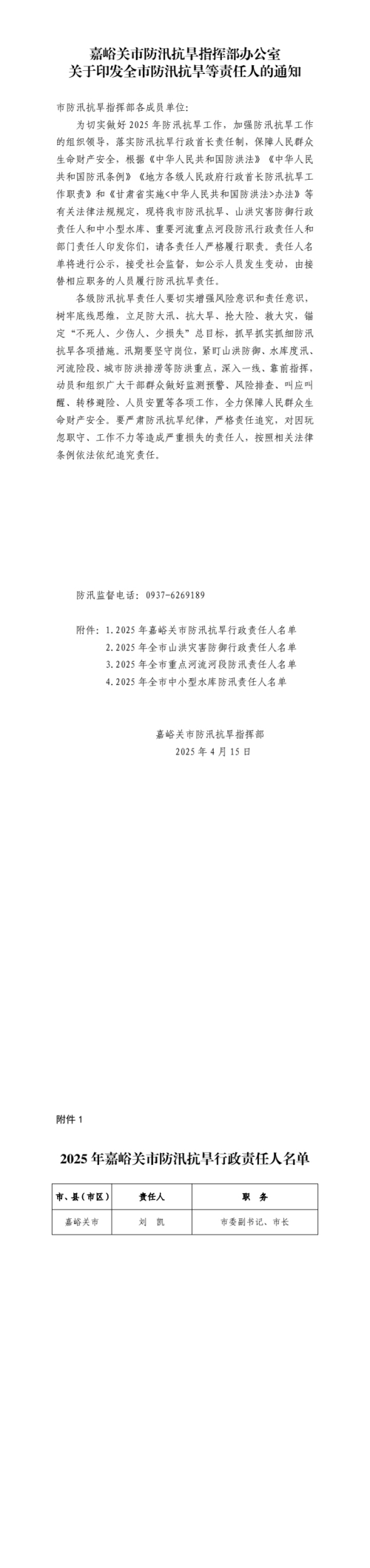嘉峪关市防汛抗旱指挥部办公室关于印发全市防汛抗旱等责任人的通知