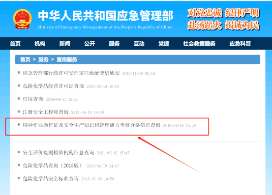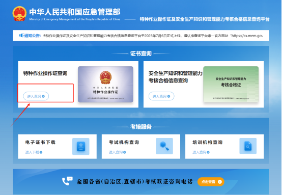 步骤 1:点击“特种作业操作证及安全生产知识和管理能力考核合格信息查询”。