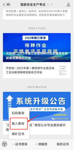 方式二:微信搜索并关注官方微信公众号“国家安全生产考试”,点击证书查询→输入查询,查询证书信息及复审时间。