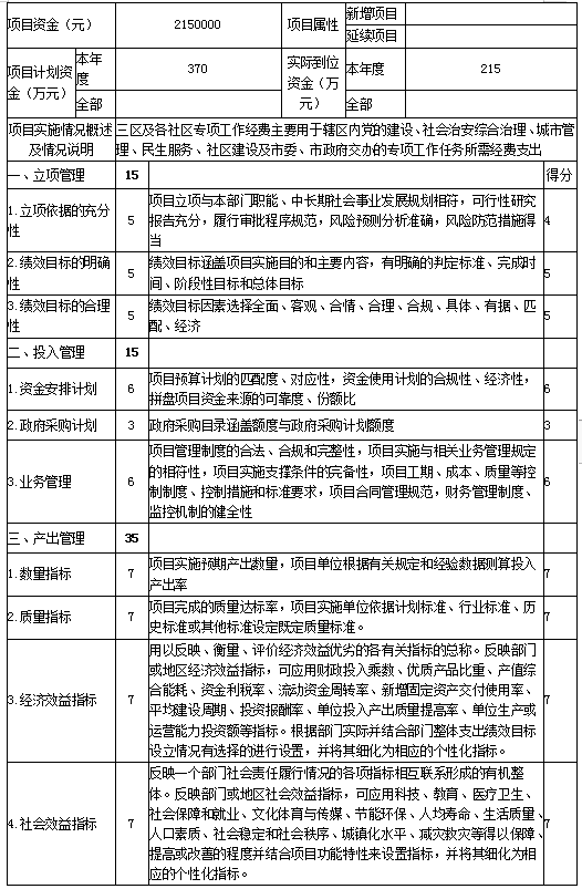 根据《嘉峪关市财政预算绩效管理实施意见(试行)》的要求,建立健全完善绩效目标管理机制和绩效评价体系,我区对2018年度一般公共预算项目支出开展绩效自评和项目自查。该项目预算总金额为215万元,其中区机关专项工作经费80万元,社区专项工作经费135万元。在资金安排上,市财政按季度分批划拨到位,我区按照年度工作计划,统筹安排各项经费支出,重点加大对辖区社会治理、民生服务、和社区建设等方面的力度。在资金使用方面,我区注重提高使用效益,厉行节约,自觉接受纪检财政审计等部门的检查,保证资金的安全有效使用。我部门均将经费使用在相关工作职能方面的支出上。