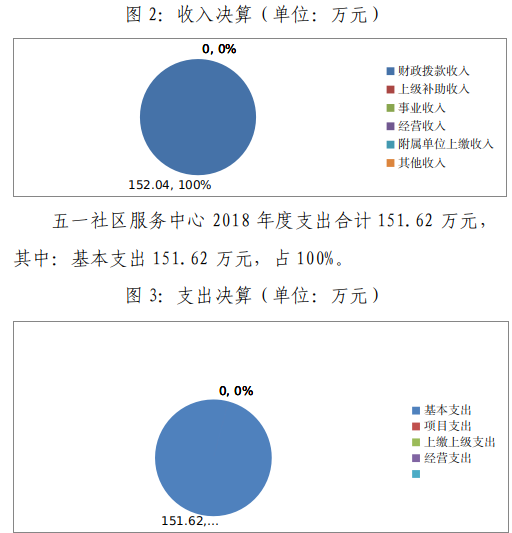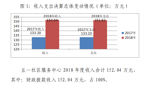 五一社区服务中心2018年度收入总计152.04万元,支出总计151.62万元。与2017年决算数相比,收入增加18.84万元,增加14.14%,支出增加18.42万元,增加13.83%。主要原因是在编人员调入、聘用人员工资调增、社会保障缴费基数调整。五一社区服务中心2018年度收入合计152.04万元,全部为财政拨款收入。