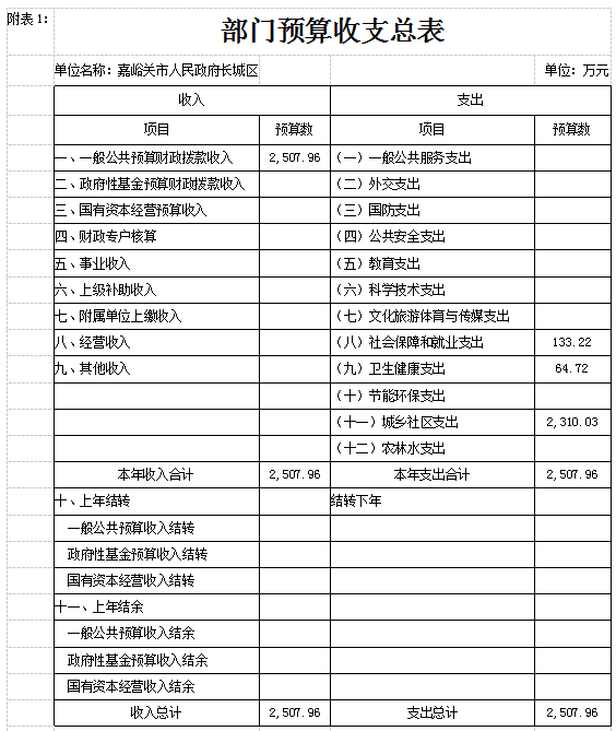 长城区2019年度部门预算总收入2507.96万元,比上年增加194.53万元,增长8.41%;总支出2507.96万元,比上年增加194.53万元,增长8.41%。