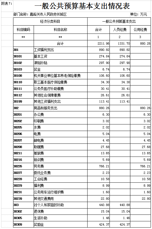 长城区2019年度一般公共预算财政拨款基本支出 2211.96万元,其中:人员经费1331.7万元,主要包括基本工资、津贴补贴、奖金、机关事业单位基本养老保险缴费、职工基本医疗保险缴费、公务员医疗补助缴费、其他社会保障缴费、其他工资福利支出、退休费、生活补助、奖励金等;公用经费880.26万元,主要包括办公费、印刷费、水费、电费、邮电费、差旅费、培训费、劳务费、委托业务费、工会经费、福利费、公务用车运行维护费、其他交通费用等。