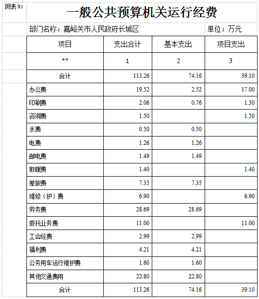 长城区2019年度一般公共预算机关运行经费安排支出预算数113.26万元。比上年增加60.47万元,增长114.55%。