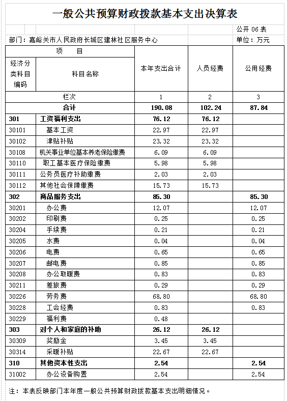 建林社区2018年度一般公共预算财政拨款基本支出190.08万元,其中:人员经费102.24万元,主要包括基本工资、津贴补贴、奖金、社会保障缴费、其他工资福利支出、奖励金、采暖补贴;公用经费87.84万元,主要包括办公费、印刷费、手续费、水费、电费、邮电费、取暖费、差旅费、劳务费、工会经费、福利费、办公设备购置等。