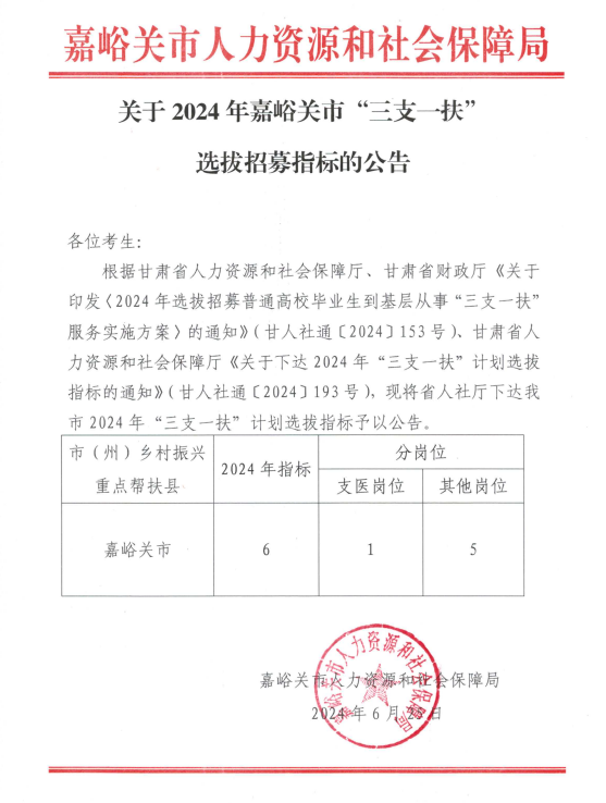关于2024年嘉峪关市“三支一扶”选拔招募指标的公告