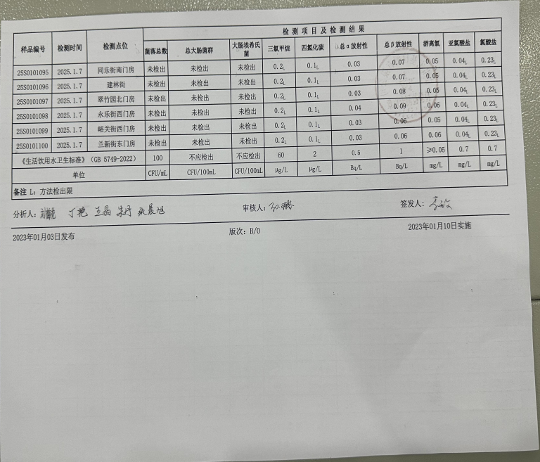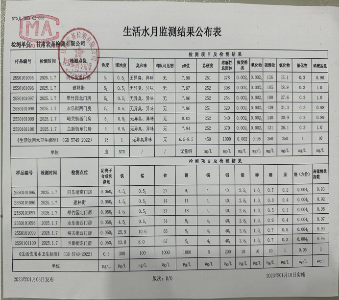 嘉峪关市嘉恒公司1月水质检测结果公示