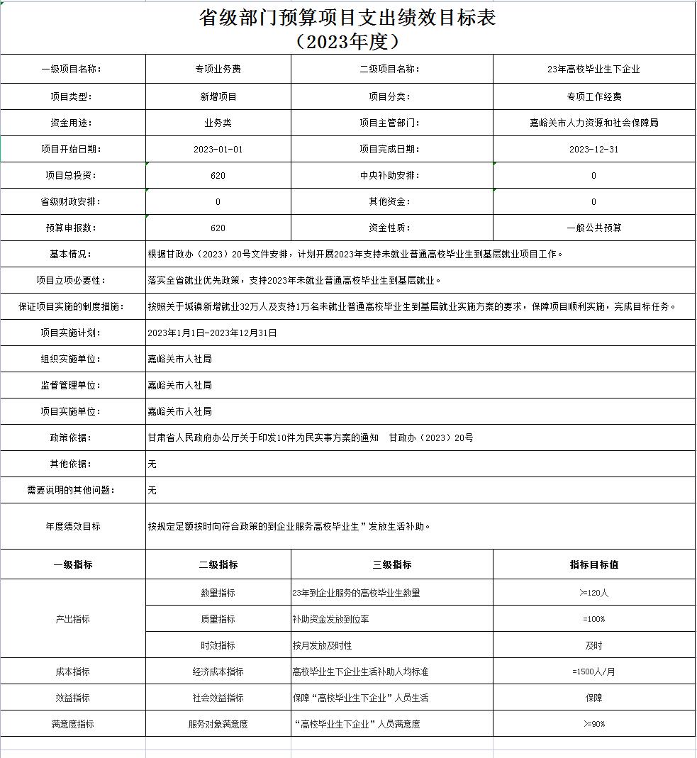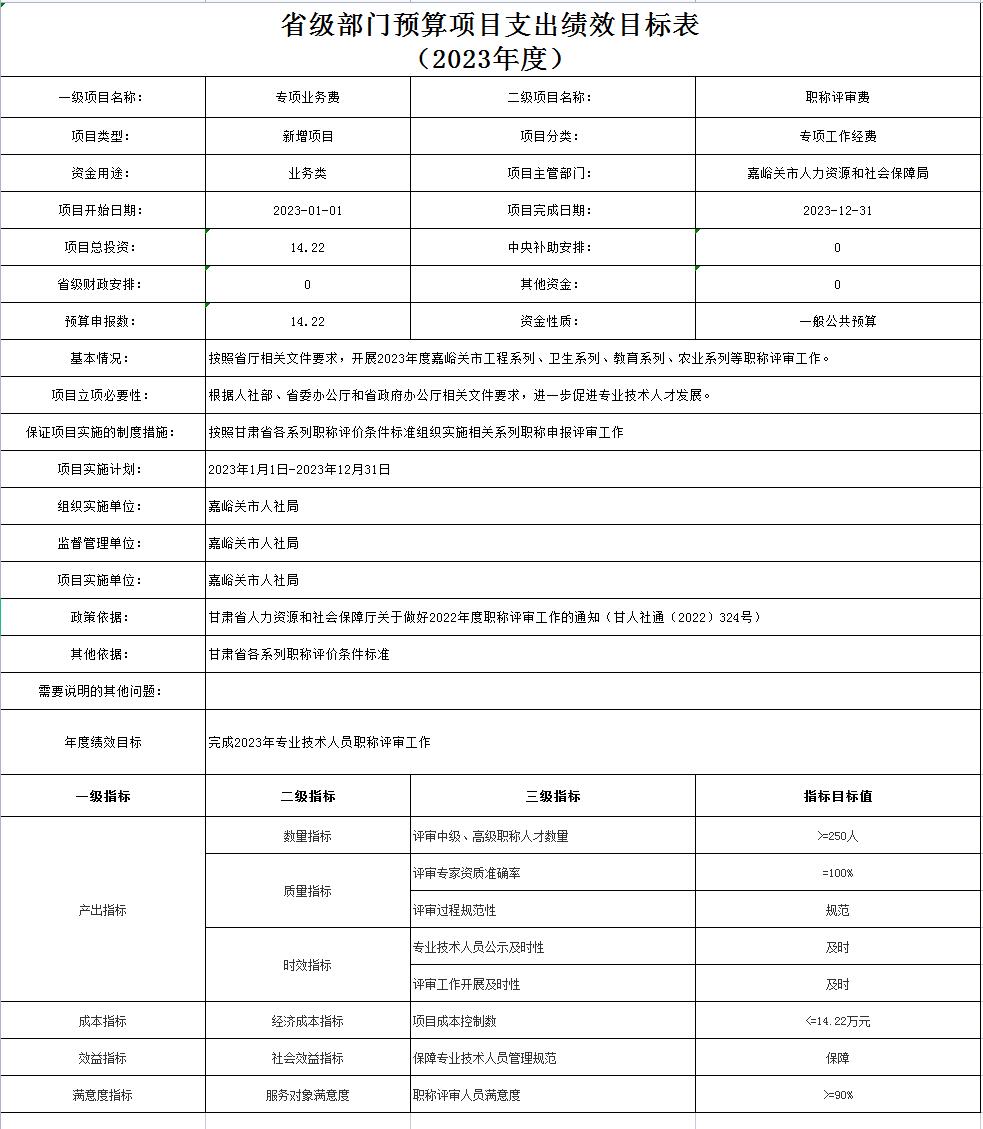 2023年本单位按照指向明确、具体细化、合理可行的原则,对预算编制申报的专项业务费均制定了绩效目标,共涉及财政资金763.73万元,主要包括以下17个专项业务经费:2023年高校毕业生下企业生活补助620万元,职称评审经费14.22万元;社保经办业务费4万元,工伤案件经办费4万元,劳动保障监察执法车辆租赁费2万元;考试考务费87.49万元;农村养老保险代办员岗位补贴1.02万元;国有企业职工工资收入监督检查经费2万元;仲裁专递邮寄费2万元;法律顾问费及诉讼案件费3万元;春节慰问金4万元;就业补助20万元;上年结转资金226.5万元。我局将按照预算批复下达的专项经费,在年度工作组织实施完毕时,认真开展绩效自评工作,确保绩效评价结果真实、公正、客观、准确。