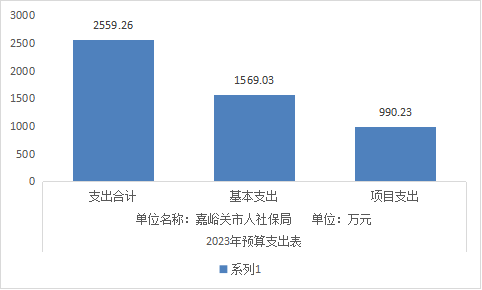 嘉峪关市人力资源和社会保障局2023年度支出合计2559.26万元,其中:基本支出1569.03万元,占61.31%;项目支出990.23万元,占38.69%。