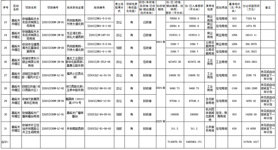 列入《储备计划》的项目共31个(37宗),拟/已入库面积共646.5964公顷。其中,往年存量建设用地结转入库项目1个(1宗),入库面积0.0235公顷;往年收储结转入库项目14个(18宗),入库面积510.3871公顷;往年棚户区改造腾退结转入库项目5个(5宗),入库面积24.0467公顷;往年批次建设用地使用国有未利用地计划结转入库项目2个(2宗),入库面积14.7公顷;2023年新增列入计划项目9个(11宗),拟入库面积:97.4391公顷。