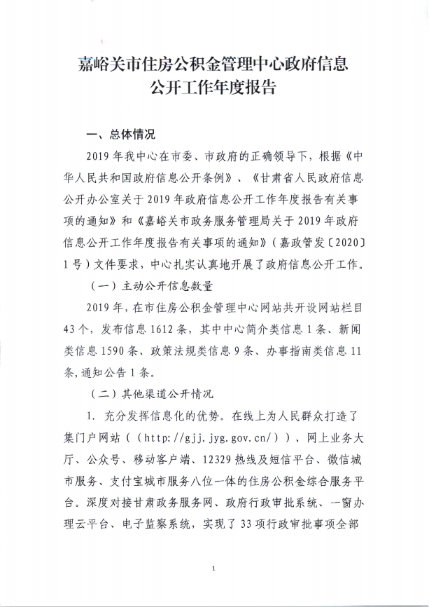 嘉峪关市住房公积金管理中心政府信息公开工作年度报告(2019)