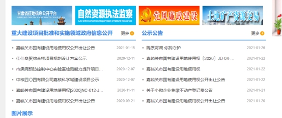 6.征地信息。在国有土地房屋征收方面,切实做好房屋征收补偿方案(征求意见稿)、决策依据、征求意见情况和修改公告等决策预公开。门户网站设置“用地计划”、“建设项目信息”专栏,年内发布嘉峪关市2020年度建设用地供应计划等重要信息。充分发挥线上线下平台作用,通过“嘉峪关市自然资源局”微信公众号、办事大厅电子触摸屏等多种渠道,不断丰富信息公开形式,公开效果持续向好。对于社会关注度高的重大建设项目中,我市将建设用地预审意见、征收土地方案、征收土地补偿清算表、设施农用地备案、建设用地登记备案、土地招拍挂及建设用地批复进行了发布。