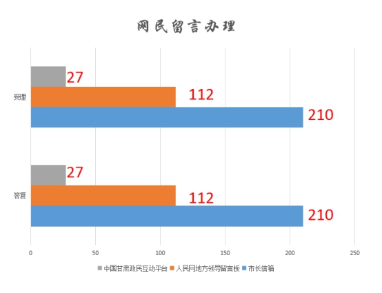 3.做好网民留言办理。网民留言是新形势下群众工作的重要内容和知民情、聚民智、解民意的一项重要渠道。通过网民留言办理,切实有效地解决了一批网民关注的热点和难点问题,促进了政府部门工作作风的转变,拉近了政府与群众的距离。共编报《网民留言办理专报》41期,将市长信箱和网民留言受理及办理情况每周向市政府领导专题报告。2020年,我市共受理中国甘肃互动管理平台“政民互动”网民留言27条,已全部办结;转办“市长信箱”有效留言210条,已全部回复;受理“人民网领导留言板”留言112条,回复112条,回复率100%。受理政务服务网留言我要咨询29条,我要建议1条,我要投诉4条,已全部办结,办结率100%。