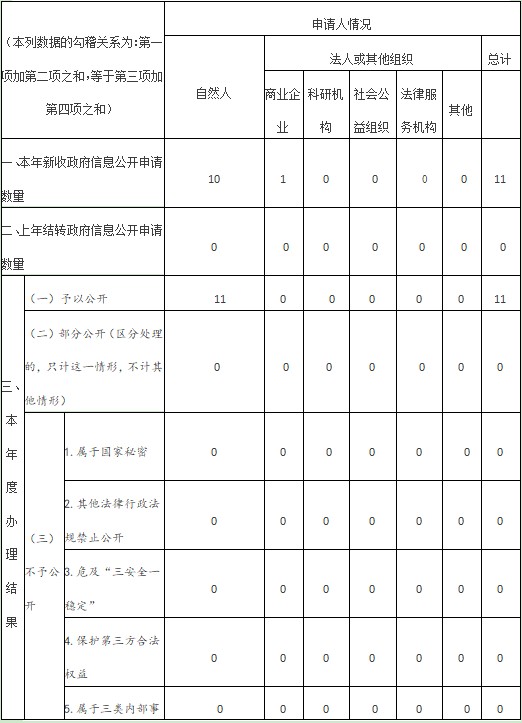 认真贯彻落实《中华人民共和国政府信息公开条例》,积极拓展依申请公开受理渠道,进一步优化和规范依申请公开接收、登记、办理、审核、答复、归档等项工作流程。注重加强与申请人的主动沟通,做到依申请公开办理依法有据、严谨规范、慎重稳妥。2020年度共受理政府信息公开申请11件,为信函申请,办结满意率为100%。