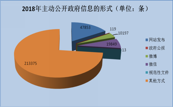 (一)主动公开政府信息的数量。2018年,我市主动公开信息总数291406条,比2017年增加279.49%。其中,公开规范性文件13件;刊发政府公报3期共119条;通过政府网站公开信息数47853条;通过政务微博公开信息数10197条;通过政务微信公开信息数19849条;通过广播、电视、报刊等其他方式公开信息数213375条。