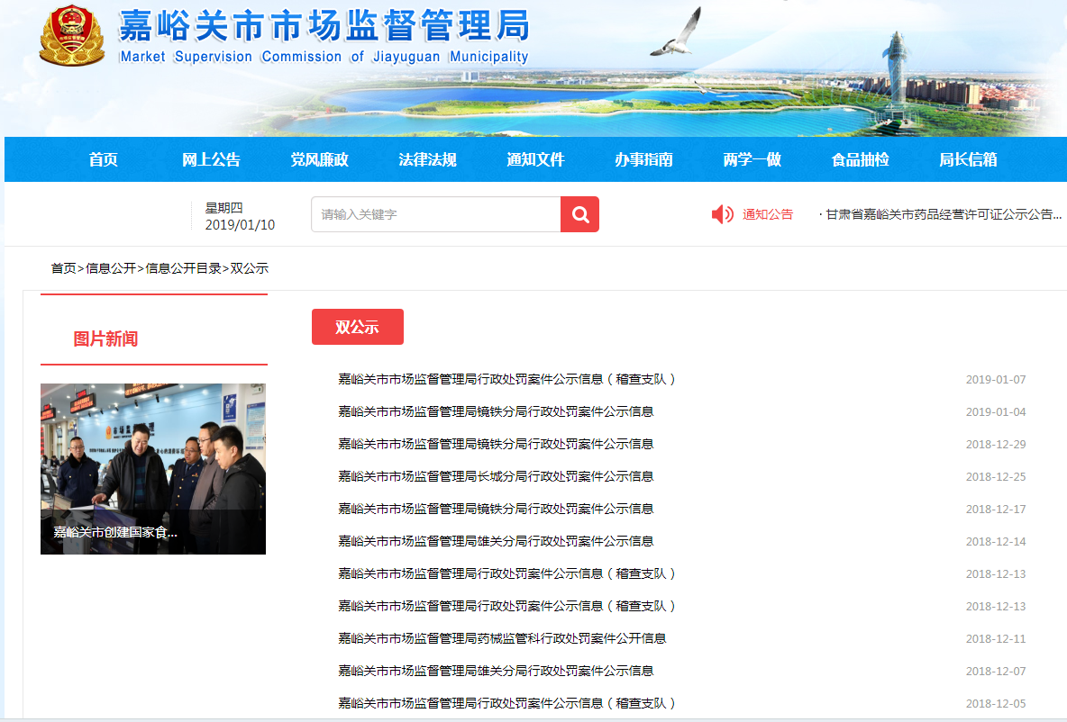 4.监管信息公开。全面推行“双随机、一公开”工作机制,创新监管理念和监管方式,提高监管效能。先后印发了《嘉峪关市市场监督管理随机抽查办法》、《嘉峪关市全面推行“双随机、一公开”监管工作实施方案》等文件,明确了总体要求、基本原则、抽查对象、抽查方式、抽查内容、抽查程序等,健全完善了工作机制。各相关部门按照方案及工