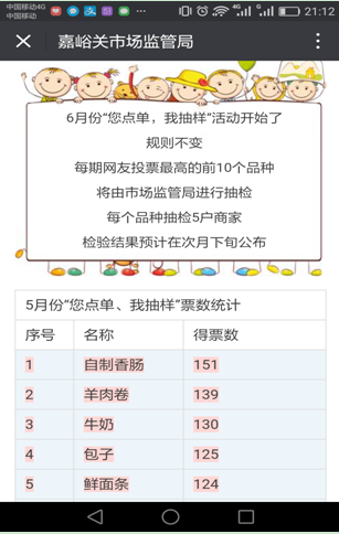 5.监管信息公开。市市场监管局加强食品药品质量监管,积极打造新媒体宣传矩阵,建立健全新媒体信息发布审核机制、新媒体信息发布保密审查制度等,并与市委宣传部、市电视台、日报社新媒体达成原创互荐机制,现已累计推送各类新媒体信息96条,每月在微信公众号开展“您点单、我抽样”食品抽检项目投票活动,现已累计参加投票5000余人次,切实增强了政务新媒体与群众的良性互动。广泛向社会公开工作地址和举报电话,查处结果