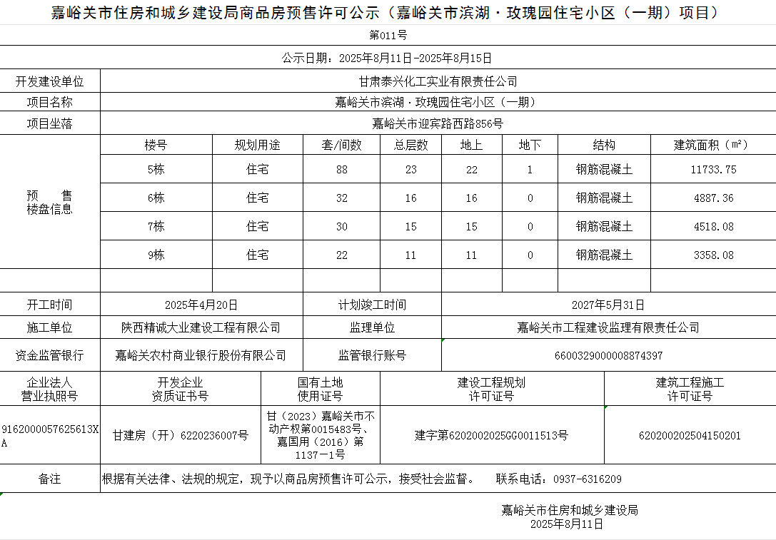 嘉峪关市住房和城乡建设局商品房预售许可公示(嘉峪关市滨湖·玫瑰园住宅小区(一期)项目)