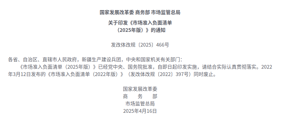 国家发展改革委 商务部 市场监管总局 关于印发《市场准入负面清单(2025年版)》的通知