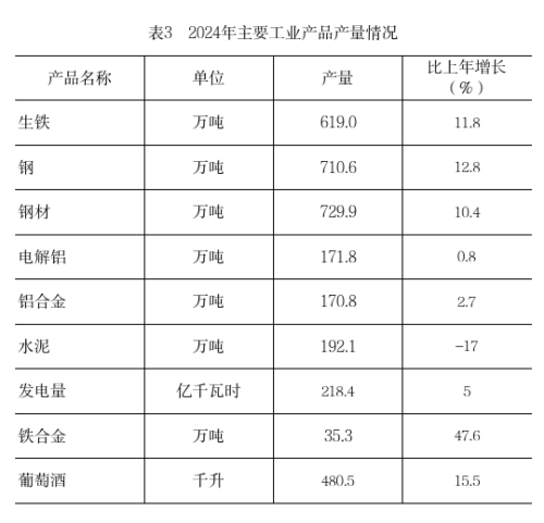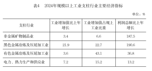 全年全部工业增加值169.4亿元,比上年增长8.3%。规模以上工业增加值增长9.6%。分轻重工业看,轻工业增长21.3%,重工业增长9.5%。分门类看,采矿业下降49.9%,制造业增长10.2%,电力、热力、燃气及水生产和供应业增长7.8%。规模以上工业企业产品产销率99.9%,与上年持平。