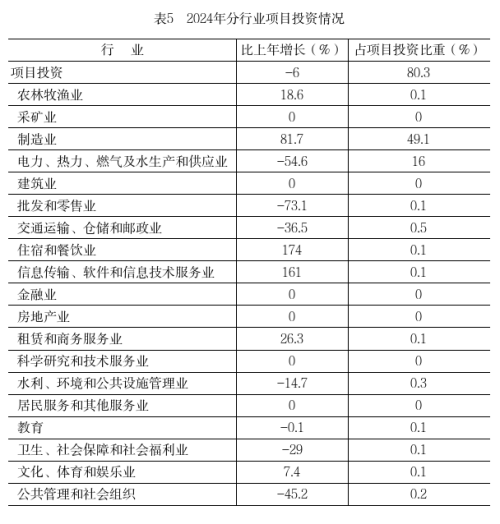 全年项目投资比上年下降6%。其中,制造业投资增长81.7%,电力、热力、燃气及水生产和供应业投资下降54.6%,交通运输、仓储和邮政业投资下降36.5%,水利、环境和公共设施管理业投资下降14.7%。
