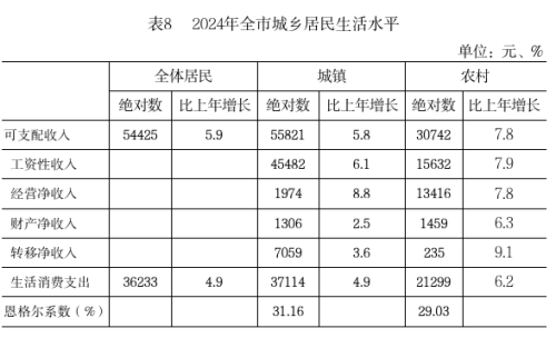 全年全市居民人均可支配收入54425元,比上年增长5.9%。按常住地分,城镇居民人均可支配收入55821元,比上年增加3060元,增长5.8%;农村居民人均可支配收入30742元,比上年增加2224元,增长7.8%。