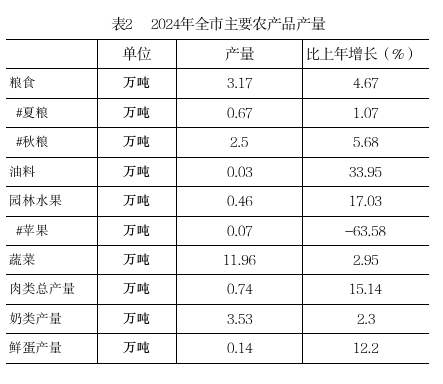 全年全市完成农业增加值7.26亿元,增长6.1%。粮食作物种植面积4.75万亩,增长3%;小麦种植面积1.54万亩,与上年同期持平;折粮薯种植面积0.05万亩,增长17.28%。粮食总产量3.17万吨,增长4.67%。其中夏粮产量0.67万吨,增长1.1%;秋粮产量2.5万吨,增长5.68%。油料播种面积1717.4亩,增长32.82%;产量348.44吨,增长33.95%;蔬菜面积2.59万亩,增长2.93%,产量11.96万吨,增长2.95%;园林水果面积7846.87亩,其中苹果面积418.13亩;园林水果产量4555.53吨,增长17.03%;苹果产量68.23吨,下降63.58%。