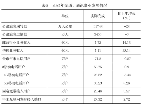 全年完成邮政行业业务收入1.72亿元,比上年增长14.13%。邮政业完成邮政函件业务6.59万件;包裹业务0.85万件;快递业务量447.74万件,增长37.93%;快递业务收入1.11亿元,增长28.14%。全年完成电信业务总量5.4亿元,增长13.79%。年末移动电话基站数0.3万个,其中4G基站0.18万个,5G基站0.12万个。全市年末电话用户总数71.2万户,其中移动电话用户58.75万户,移动电话用户中4G移动电话用户23.52万户,5G移动电话用户35.23万户。固定宽带接入用户23.46万户,比上年末增加0.81万户。其中,1000Mbps及以上接入速率用户11.17万户,比上年末增加2.28万户。全年移动互联网用户接入流量0.85亿GB,比上年增长14.86%。年末互联网宽带接入端口28.32万个,增长2.72%。固定宽带接入用户普及率80.55部/百人。