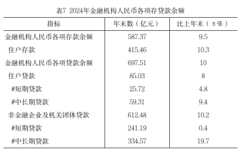 年末全市金融机构人民币各项存款余额587.37亿元,同比增加50.73亿元,同比增长9.45%。其中住户存款余额415.46亿元,同比增加38.72亿元,增长10.28%;金融机构人民币各项贷款余额697.51亿元,同比增加63.06亿元,增长9.94%。