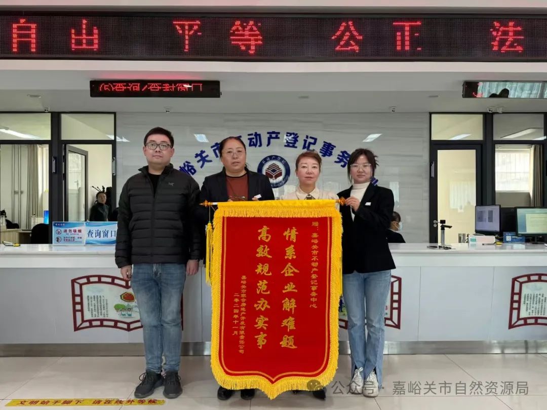 近日,嘉峪关市家合房地产开发有限责任公司负责人将一面写有“情系企业解难题、高效规范办实事”的锦旗送到嘉峪关市不动产登记事务中心,对不动产登记中心解决该企业办证问题表示衷心感谢。