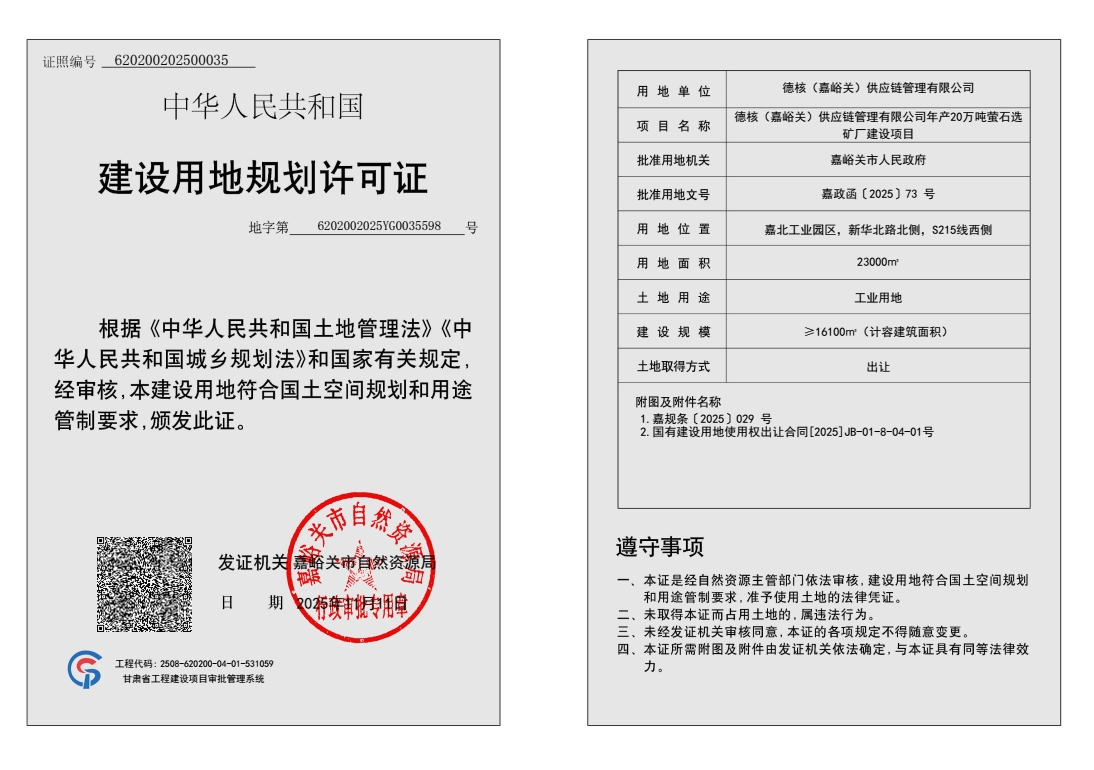 德核(嘉峪关)供应链管理有限公司年产20万吨萤石选矿厂建设项目(地字第620200202500035号)批后公布