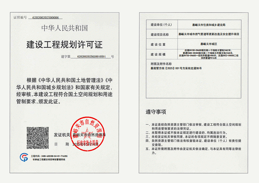 依据《中华人民共和国城乡规划法》、《甘肃省建设项目规划许可办法》(省政府169号令)有关规定,现将《嘉峪关市城市燃气管道等更新改造及安全提升项目》总平面图、建设工程规划许可证予以公布,敬请社会各界监督。监督电话:0937-6306216。