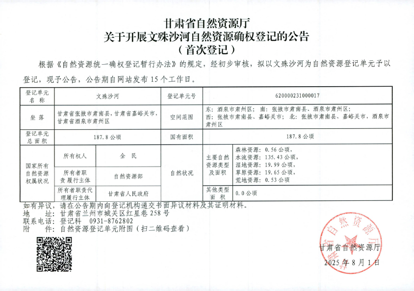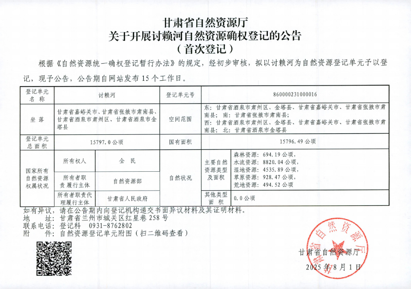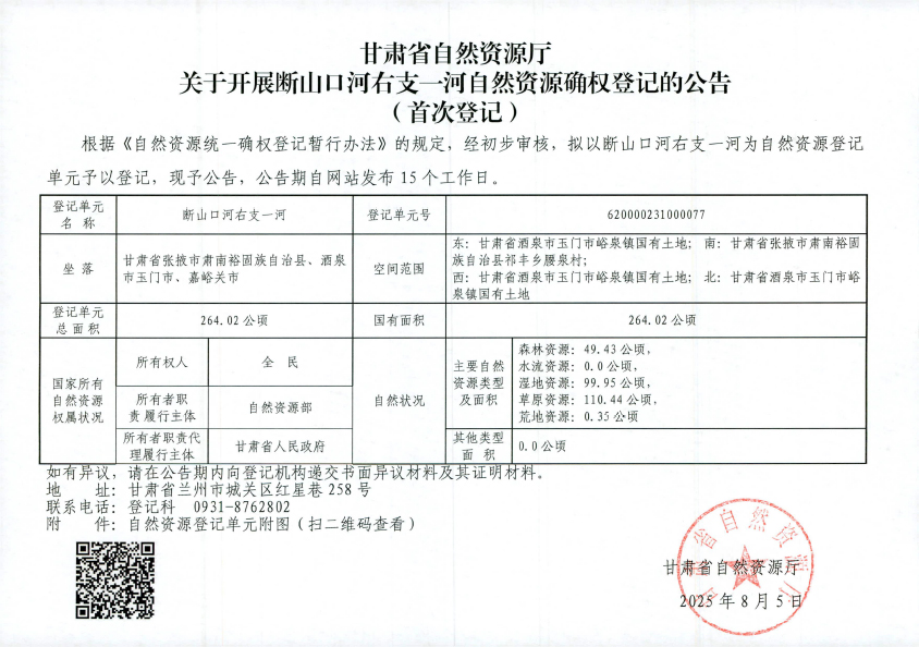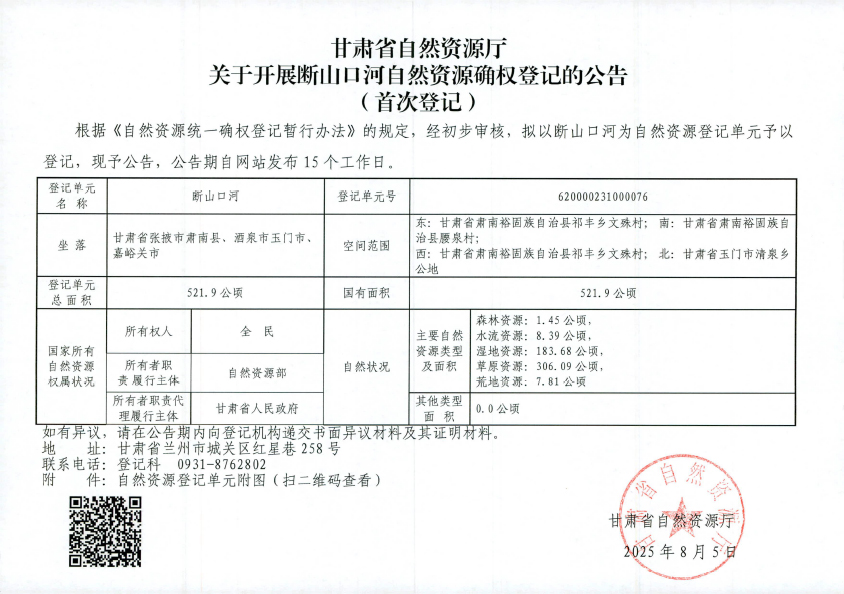 甘肃省自然资源厅关于开展断山口河等4个自然资源确权登记的公告(首次登记)