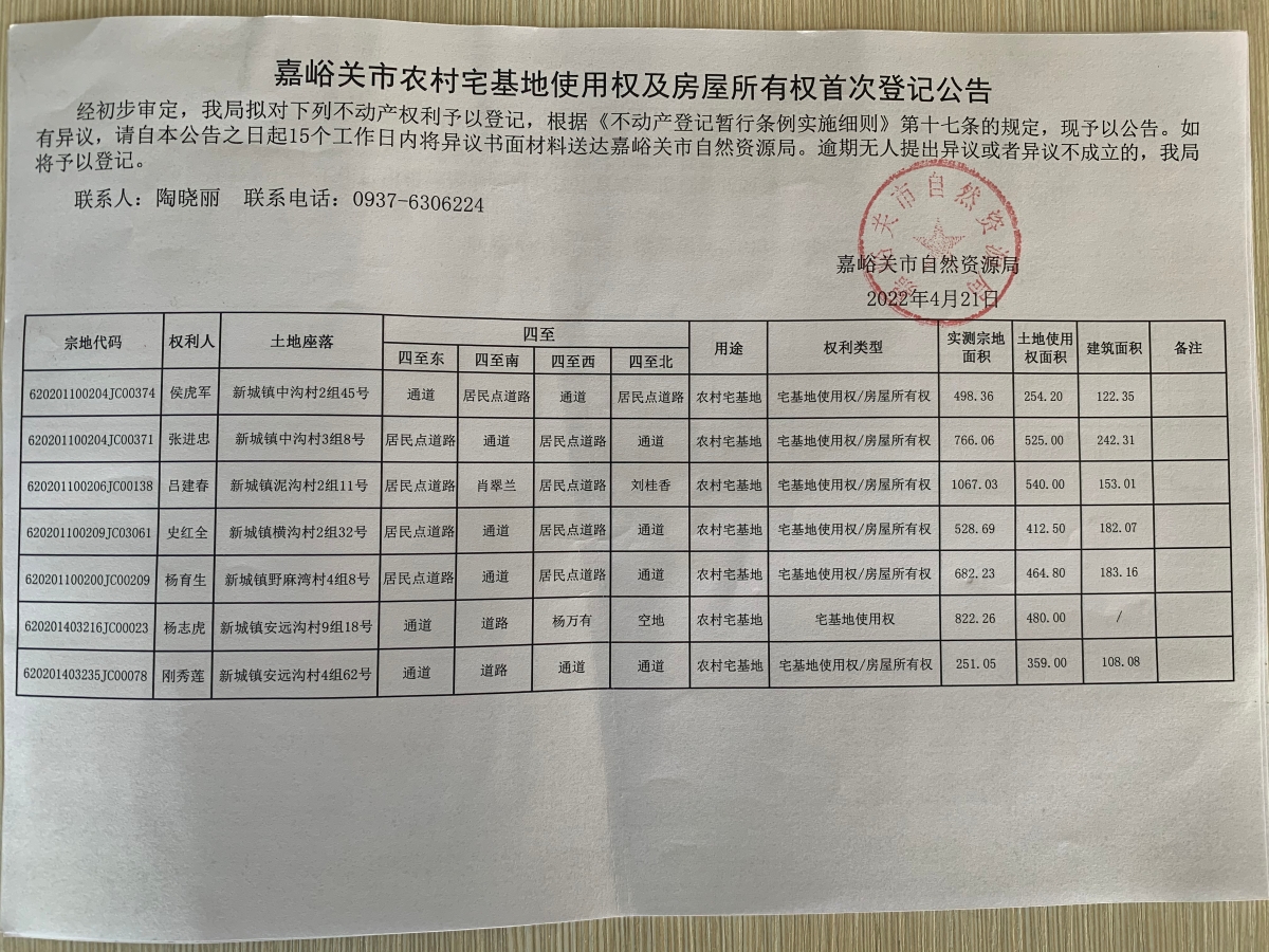 嘉峪关市农村宅基地使用权及房屋所有权首次登记公告