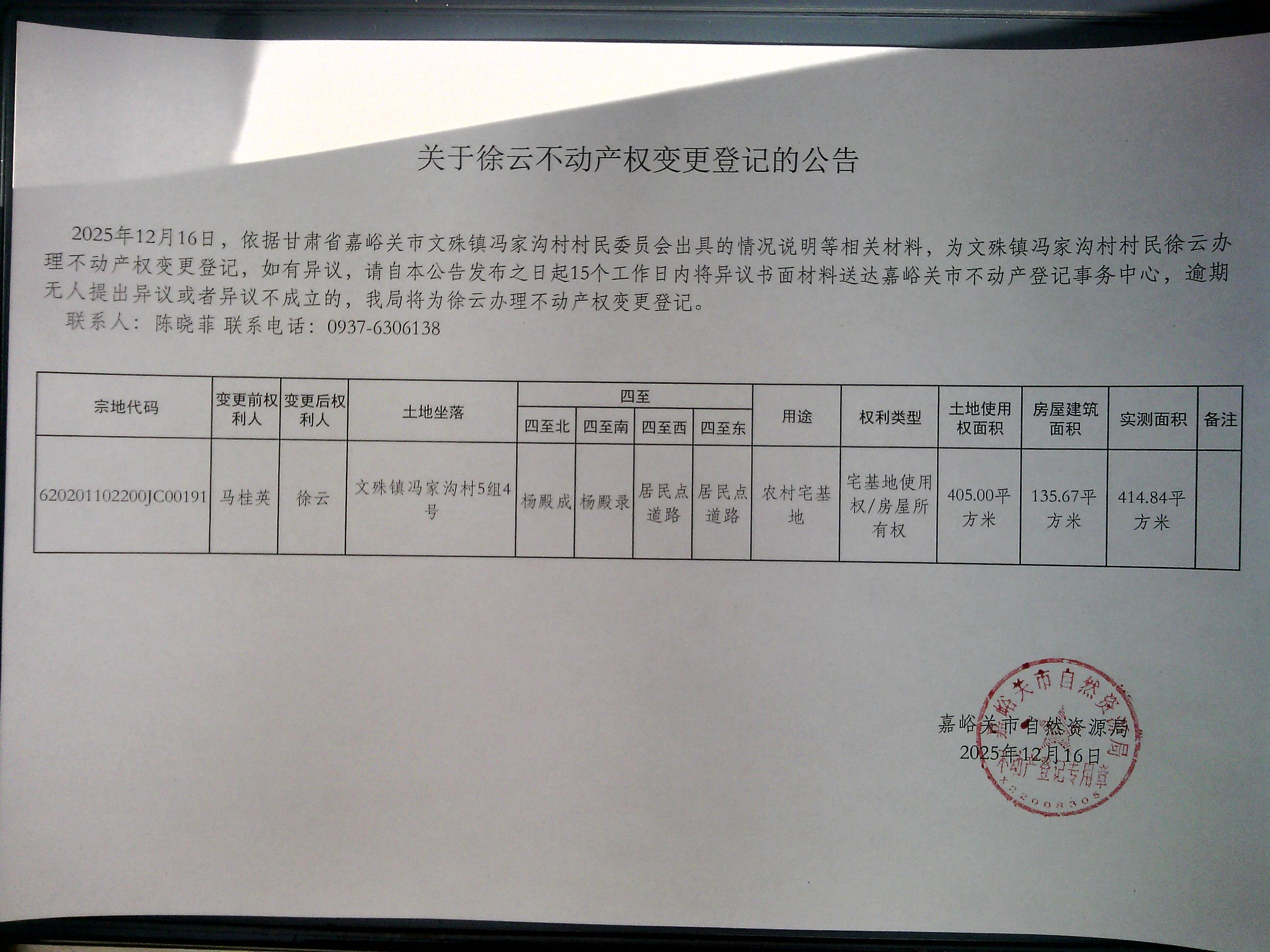 关于徐云不动产权变更登记的公告